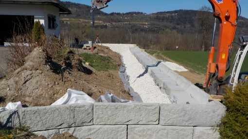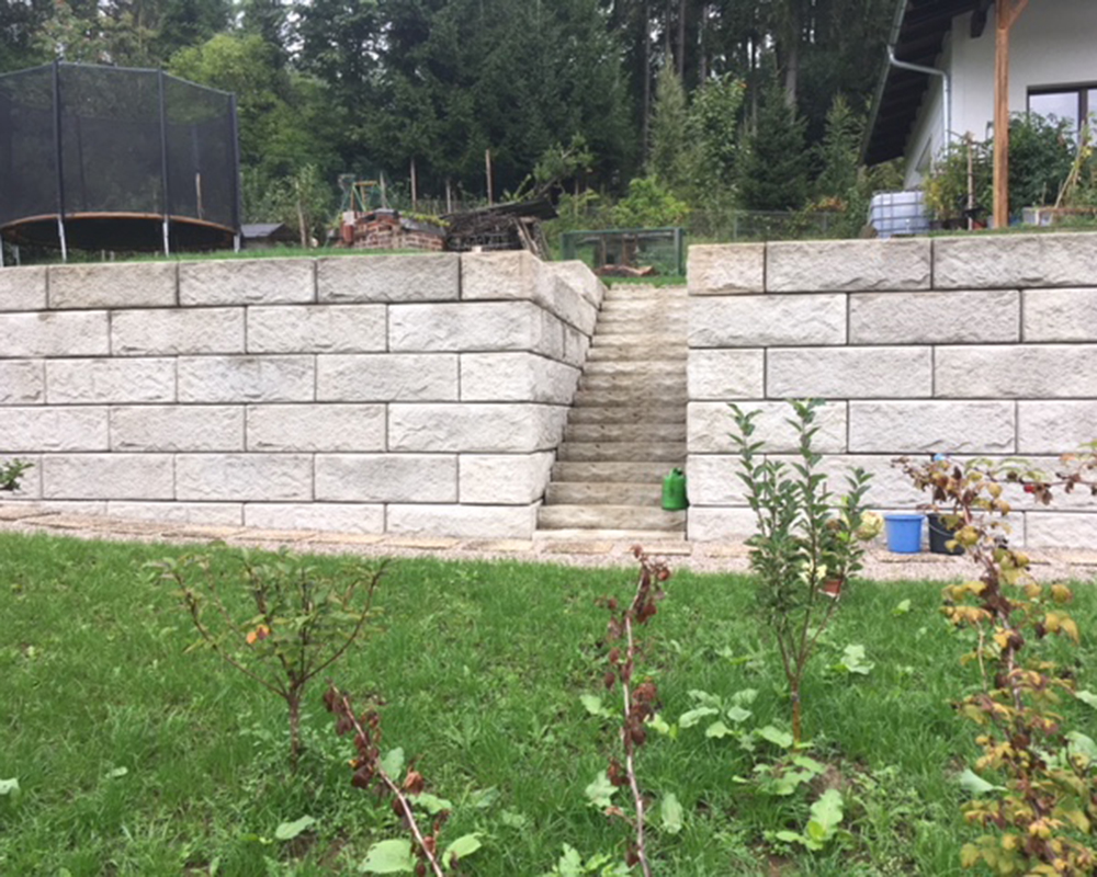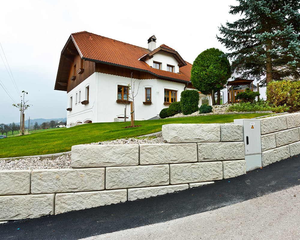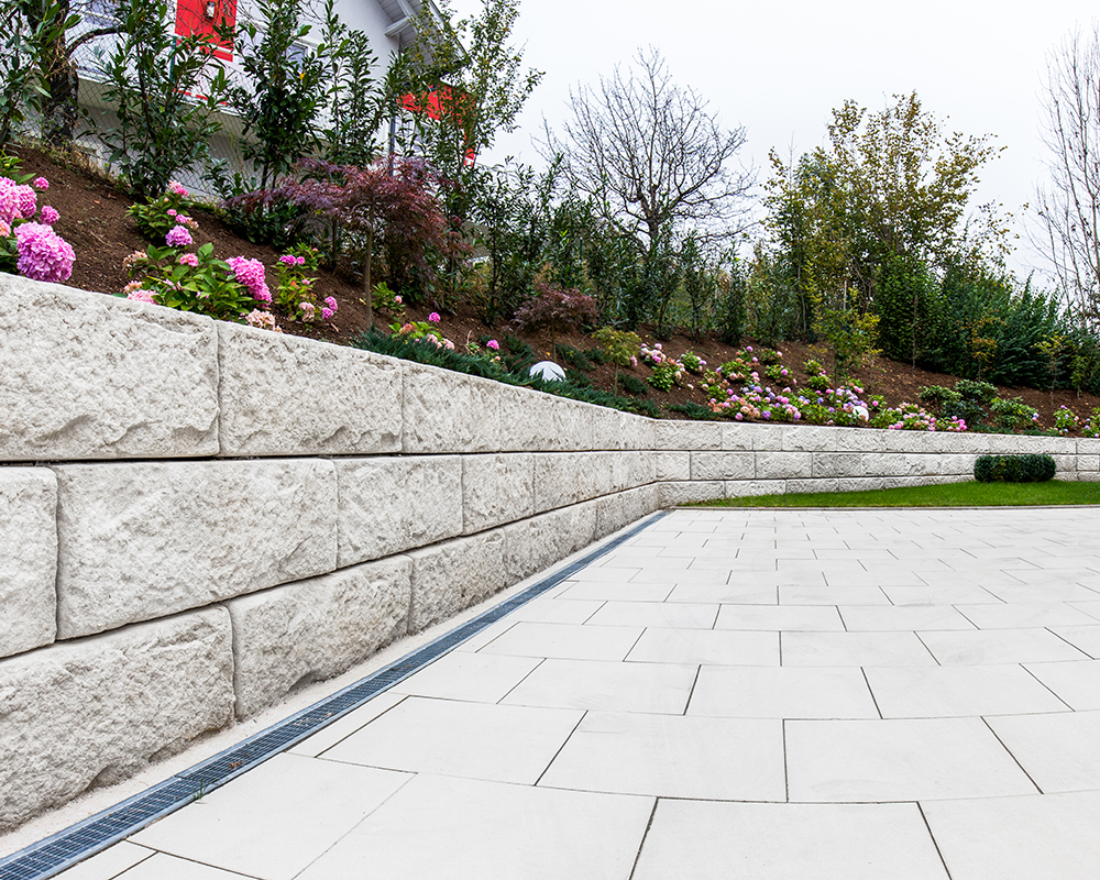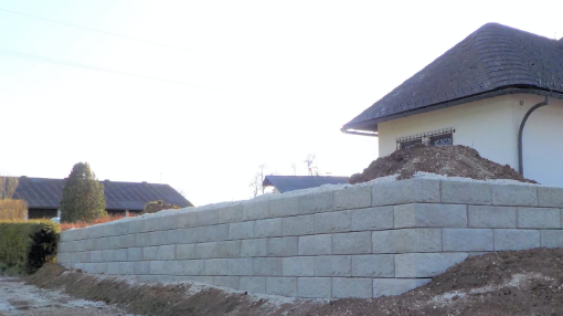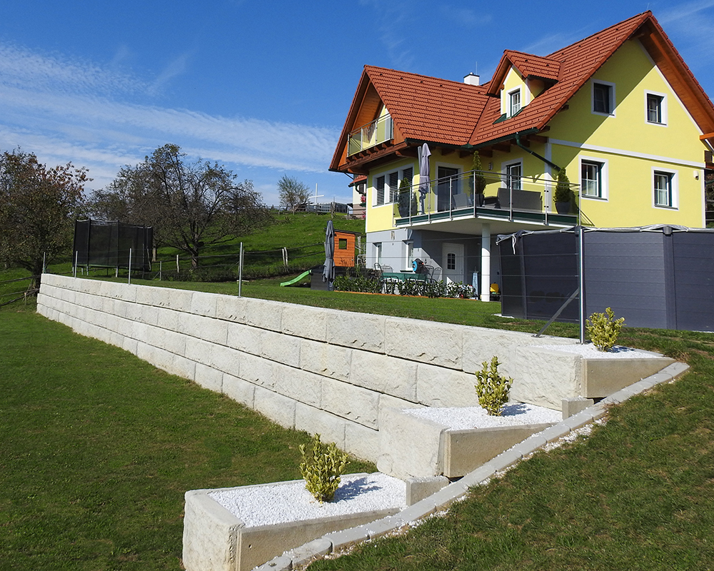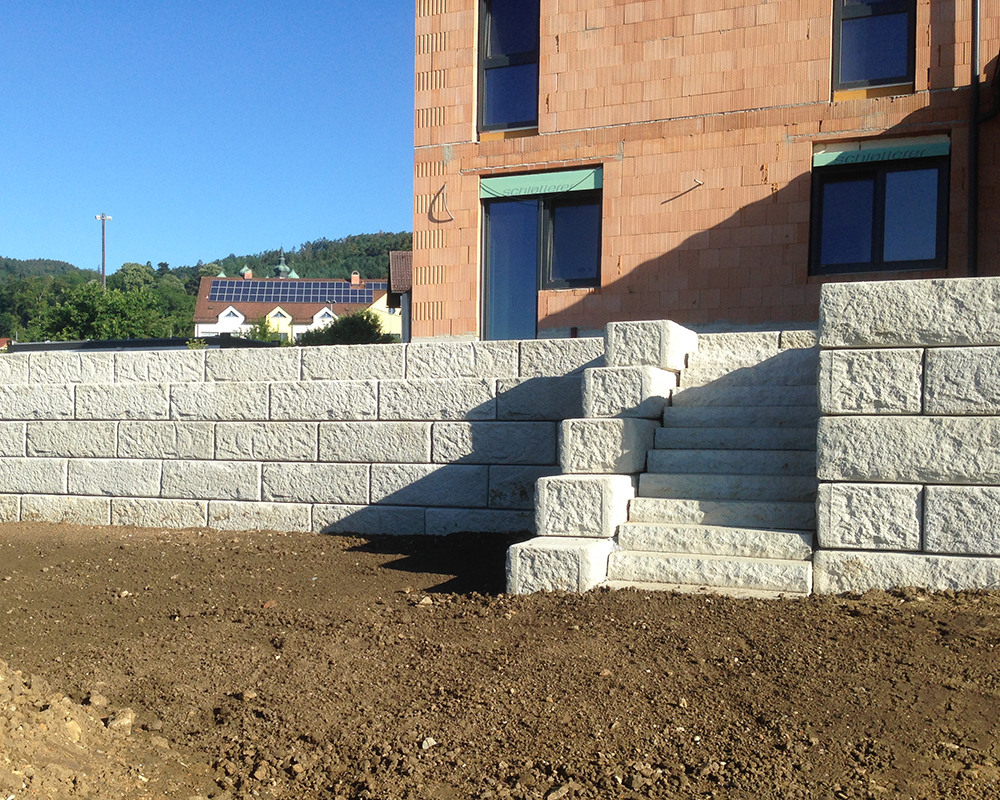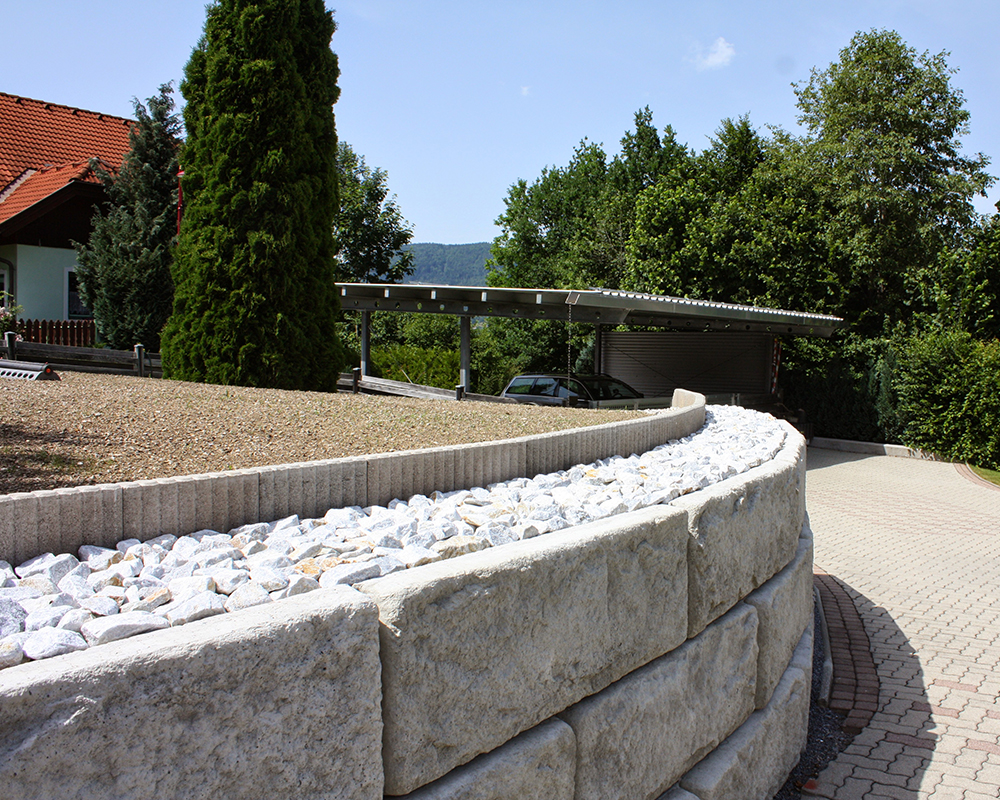 Optisch eine massive Granitblockmauer, technisch ein raffiniertes Stützwandsystem aus Beton - ideal zur Hangsicherung.