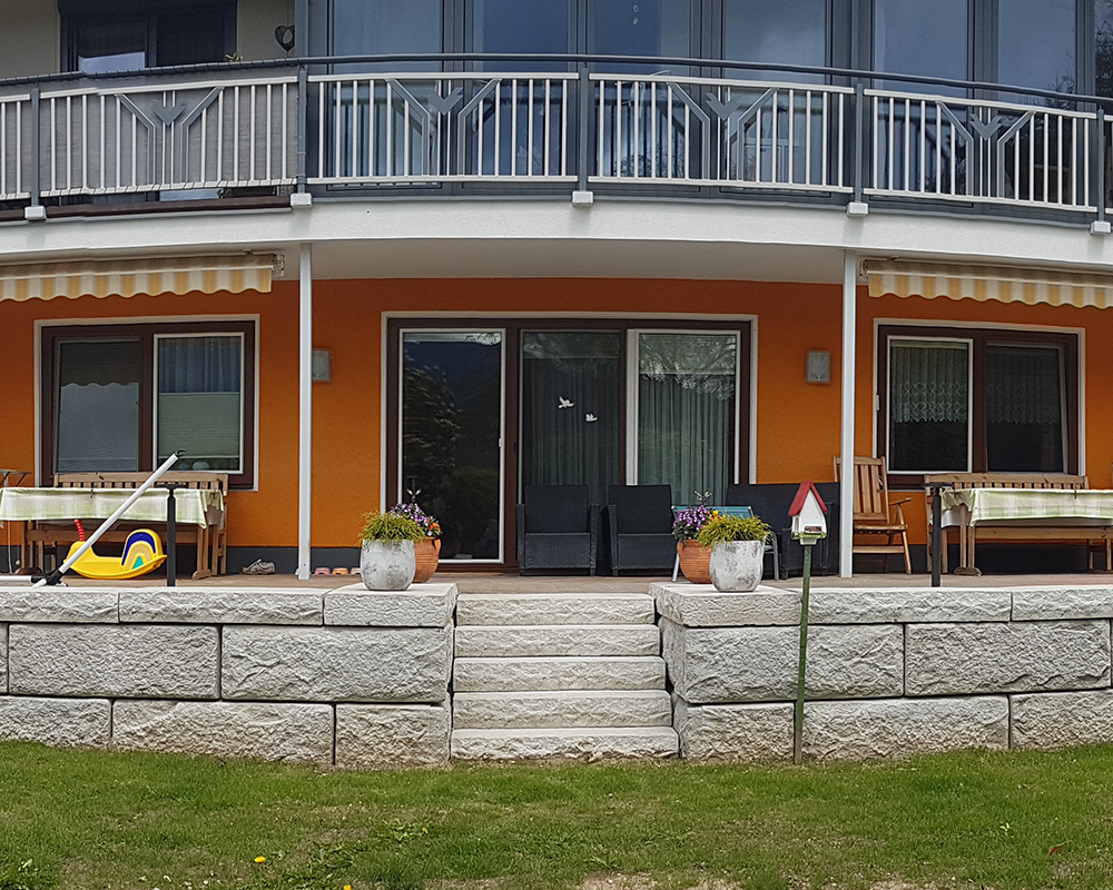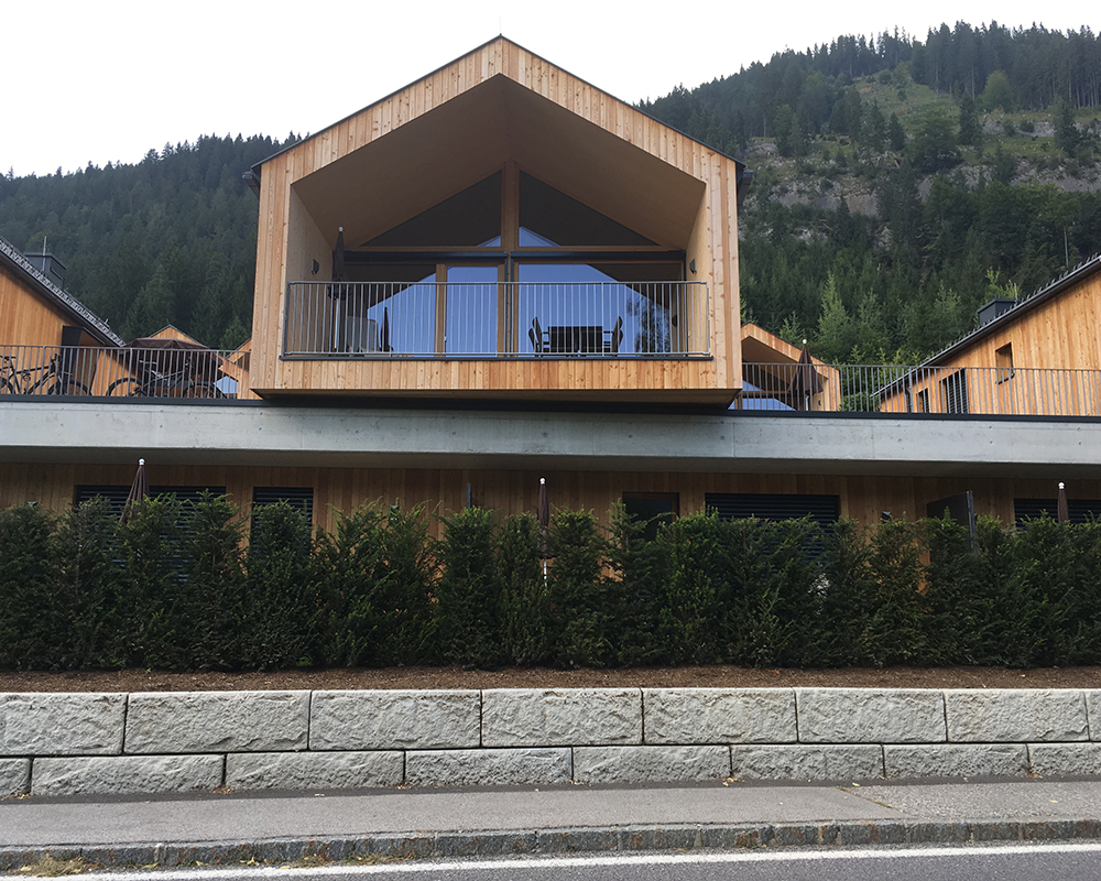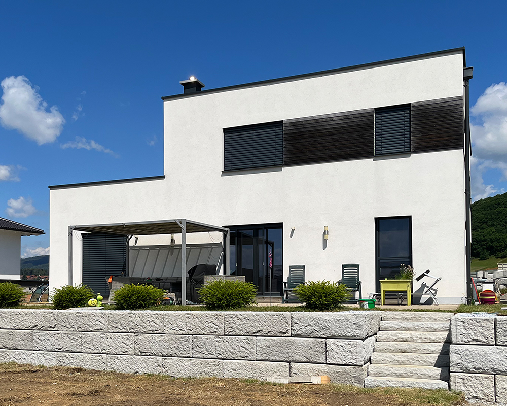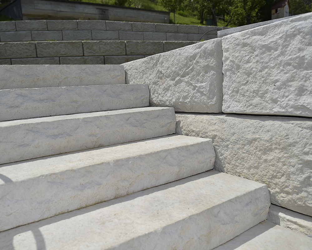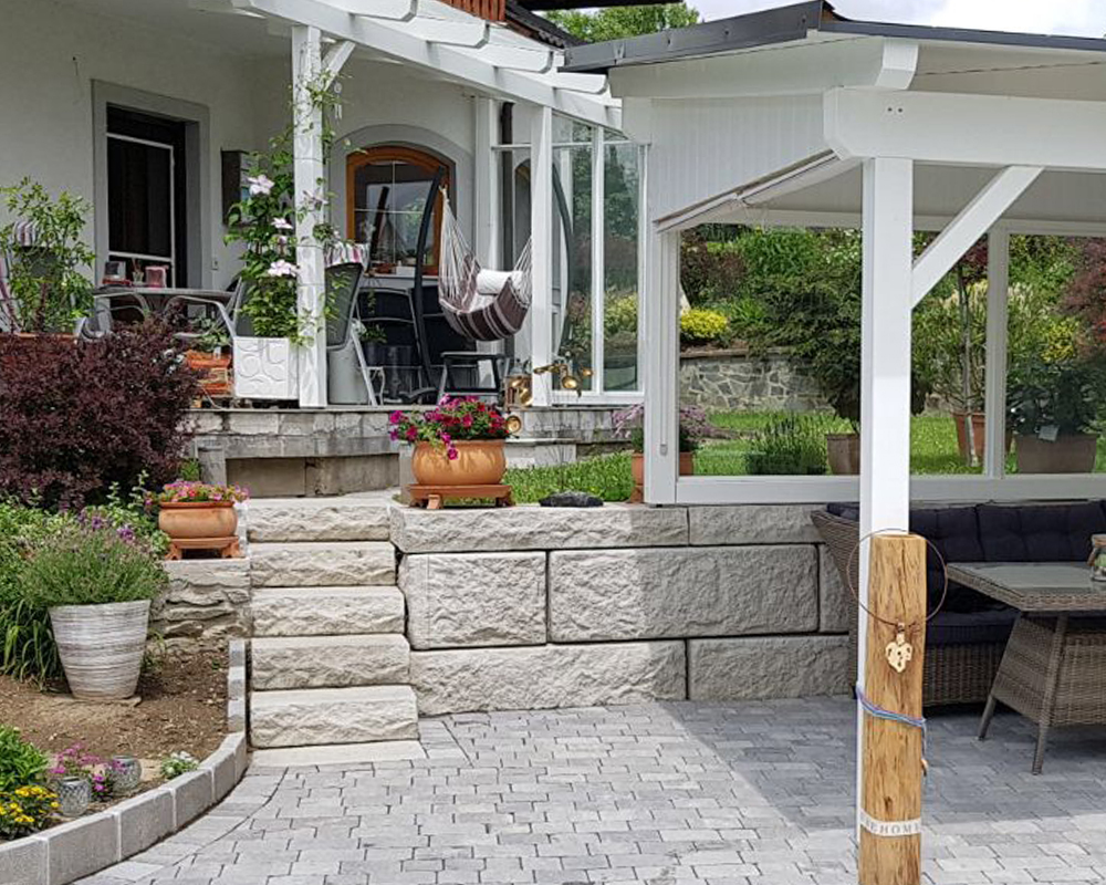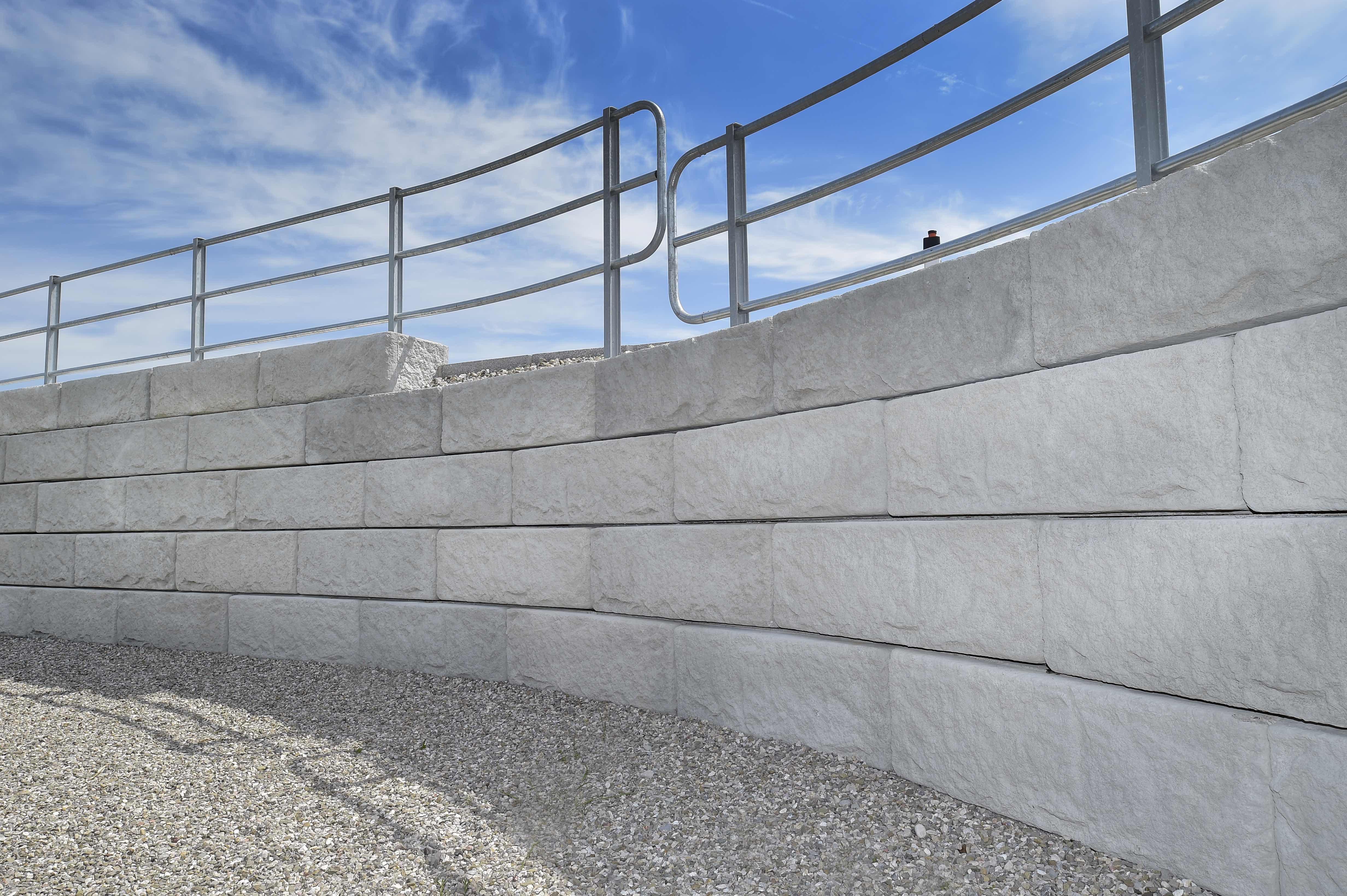 Optisch eine massive Granitblockmauer, technisch ein raffiniertes Stützwandsystem aus Beton - ideal zur Hangsicherung.