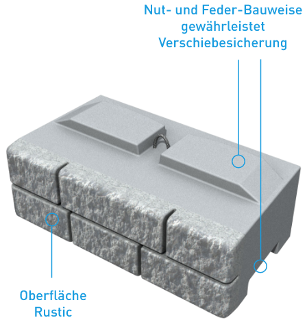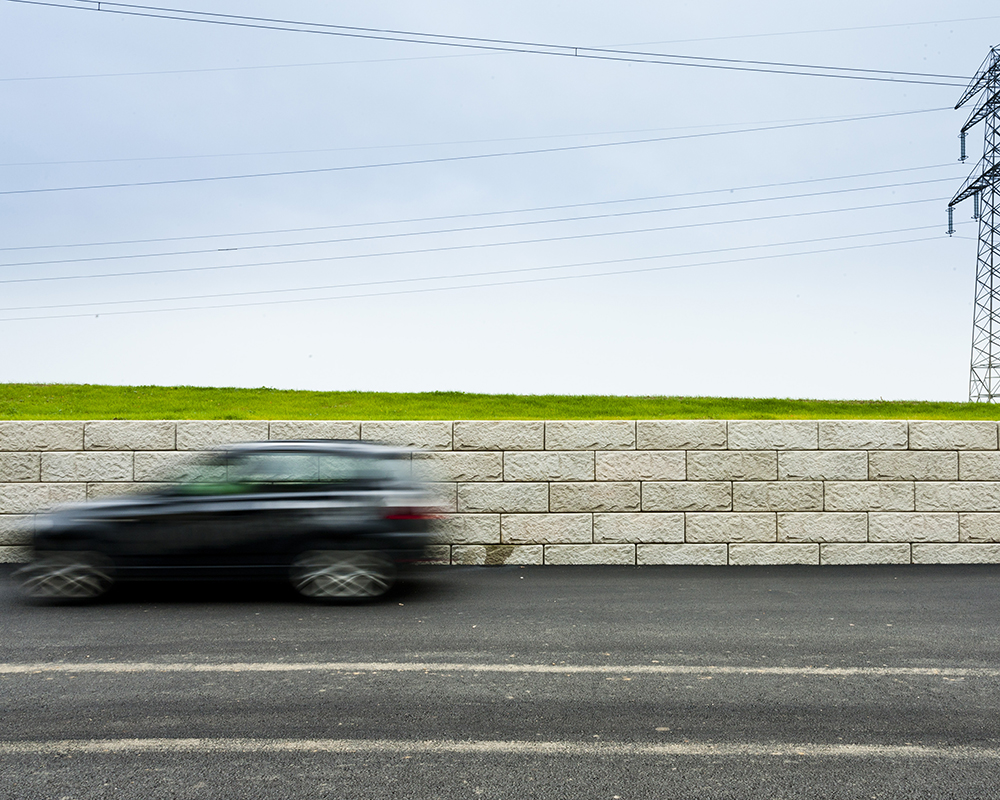 Das SW-Stützwandsystem kann sowohl als klassische Beton-Schwergewichtsmauer mit unterschiedlich tiefen Systemsteinen oder in Kombination mit Geogittern als erdbewehrte Schwergewichtsmauer ausgeführt werden. Unabhängig welche Bauweise Sie wählen – die große Versetzleistung macht das dauerhafte SW-Stützwandsystem ideal für den Infrastrukturbau.