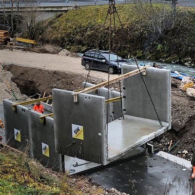 In Assling im Bezirk Lienz wurden SW-Betonfertigteile als Hochwasserschutz entlang der Drau verbaut.
