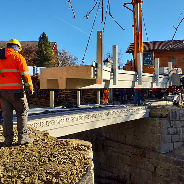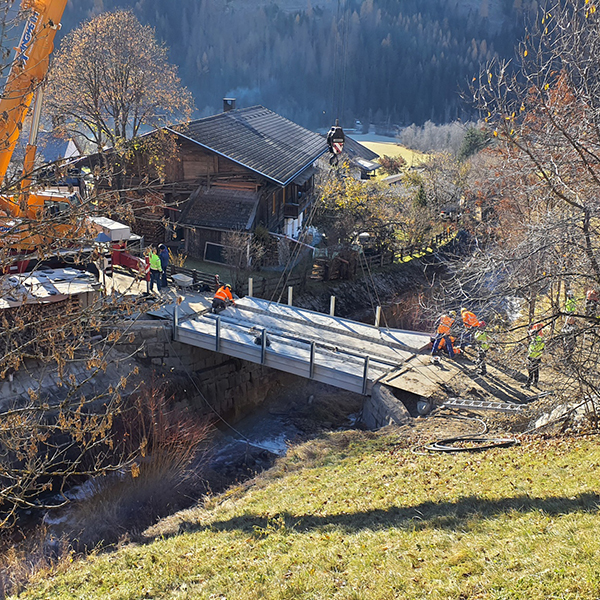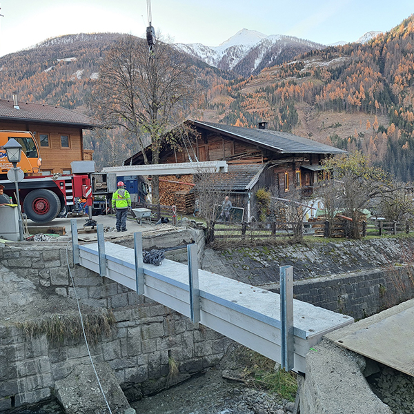 Die Brücke befindet sich in der Gemeinde Virgen in Osttirol. Das desolate Stahl-Holztragwerk wurde durch eine dauerhafte und wartungsarme Stahlbeton-Fertigteilbrücke ersetzt. Die Leitschienen konnten, an den von uns vorgesehenen Gewindeankern, ohne aufwendige Bohrarbeiten, direkt auf die beiden Außenträger montiert werden. Die Tragwerksabmessungen betragen 8,1 x 4,1 m – zudem ist die Brücke für Fahrzeuge bis 44 Tonnen befahrbar. Unsere Fertigteilbrücken verkürzen die Bauzeit und somit die Dauer der Verkehrseinschränkungen erheblich.