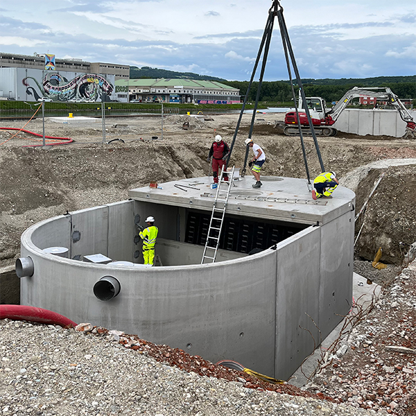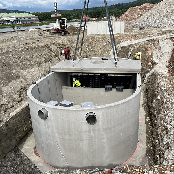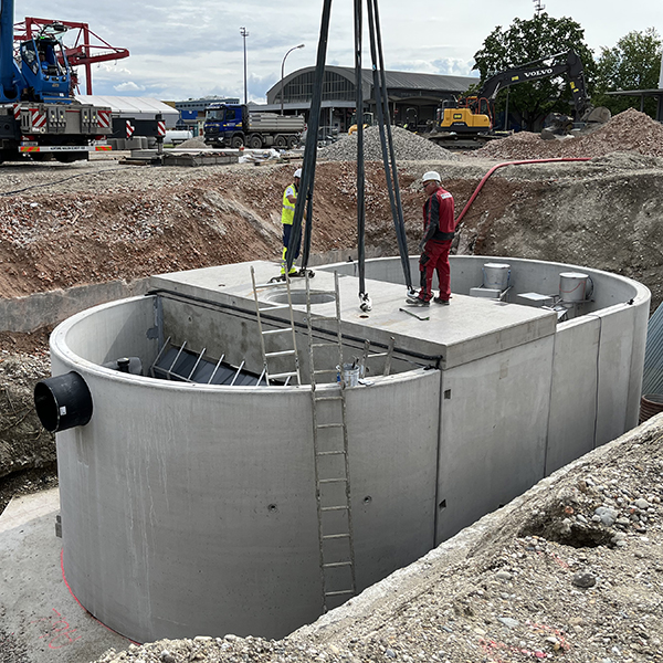 Entwässerung einer Teilfläche des Lagerplatzes bei der Zufahrt Regensburger Straße 3-4, im Hafen in Linz. Das Oberflächenwasser wird abschnittsweise gesammelt und über Verkehrsflächensicherungsschächte gereinigt und anschließend in die Donau entwässert.