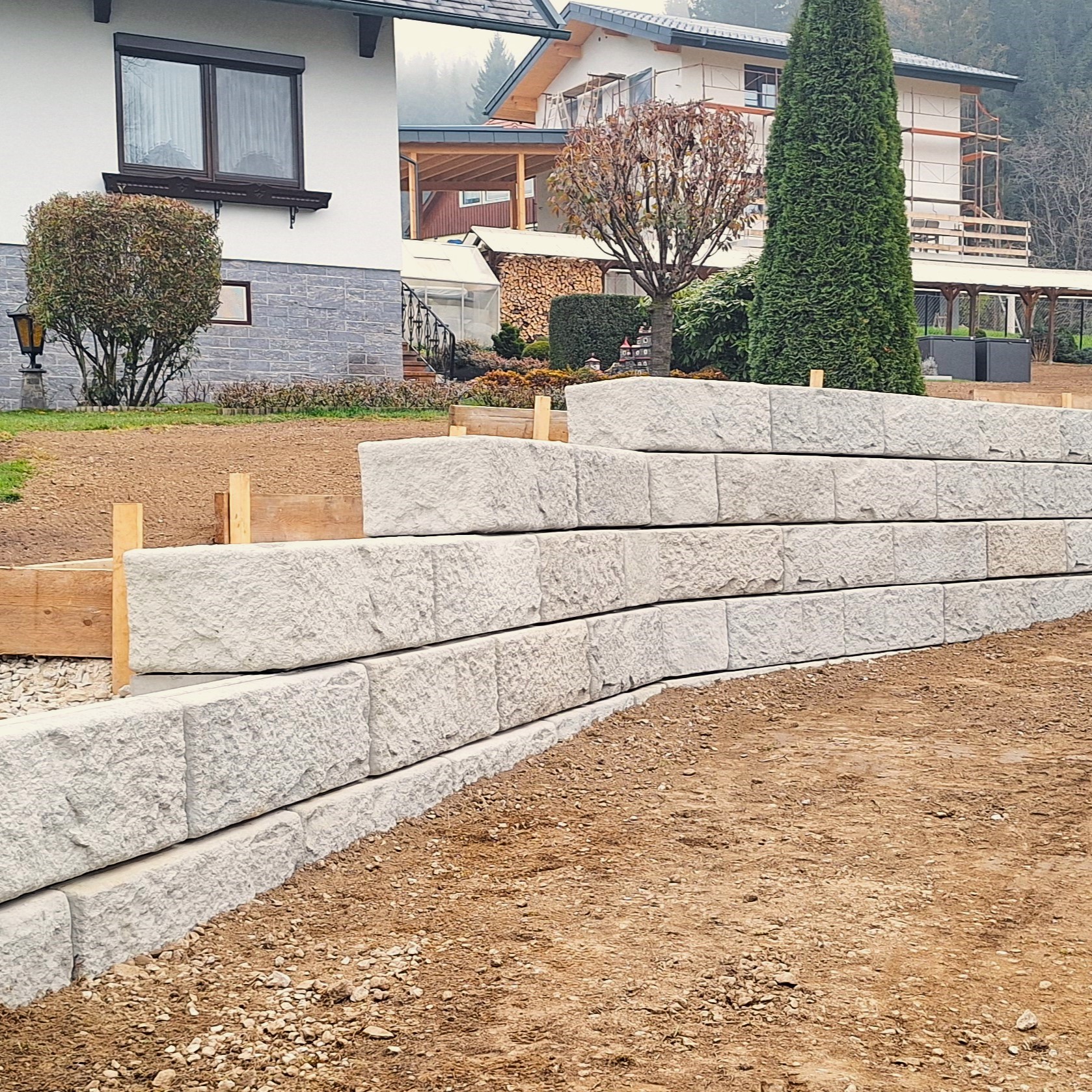 Durch den Einsatz der SW-Stützwandsteine im Radius (innen und außen) konnte die nutzbare Gartenfläche entlang eines geschwungenen und ansteigenden öffentlichen Weges erheblich vergrößert werden.