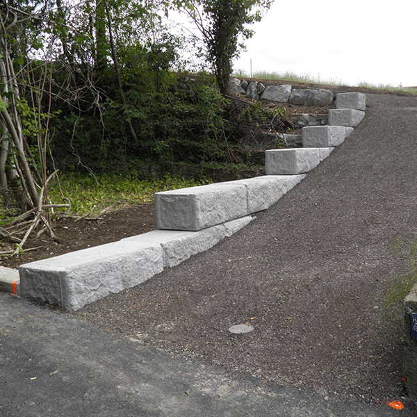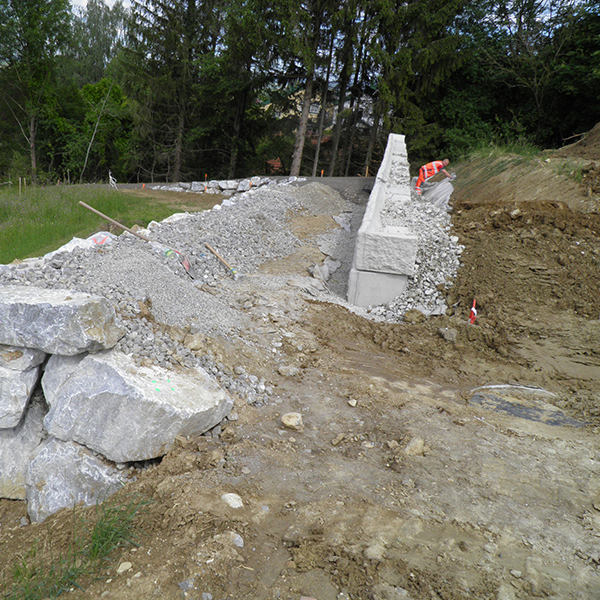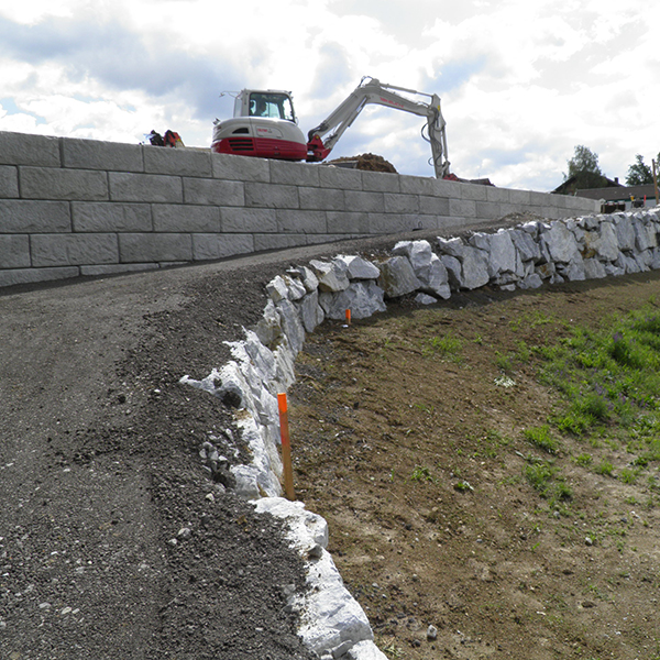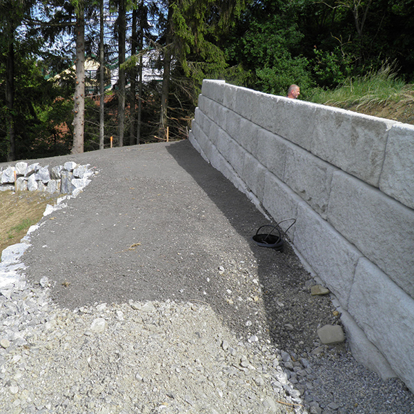 In der Marktgemeinde in St. Margarethen im Burgenland wurde an einem Fußweg entlang ein SW-Stützwandsystem errichtet. Die Ausführung erfolgte teilweise mit Vollsteinen als Abschluss.