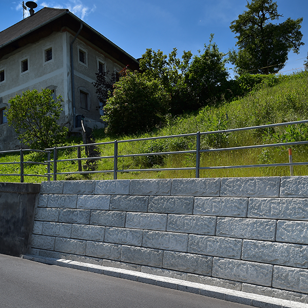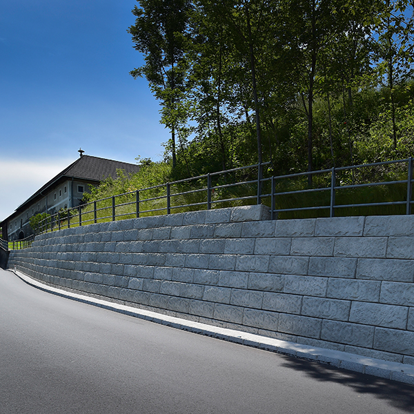 Die Straßenmeisterei Steyr hatte die Herausforderung die Straße zu verbreitern und musste diese Aufgabe in der schnellst möglichen Zeit vollbringen. Hierfür wurde das flexible SW-Stützwandsystem verwendet. Der dahinter liegende Hang musste abgestützt werden - dies wird mittels einer Fundamentneigung und der daraus resultierenden Wandneigung von ca. 10° gewährleistet.