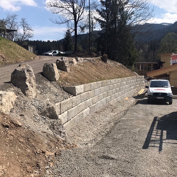 Im Zuge der Hotelerweiterung des Hotels Wilder Kaiser in Scheffau wurden bei der Parkplatz- und Parkdeckerrichtung, sowie bei der Außenanlagengestaltung auf das SW-Stützwandsystem gesetzt.