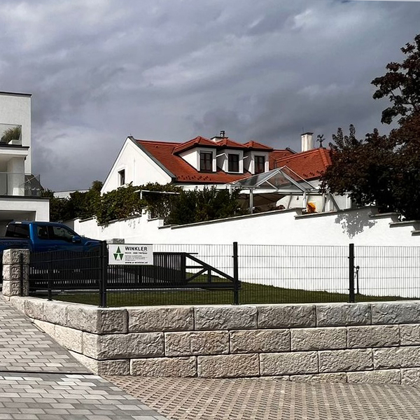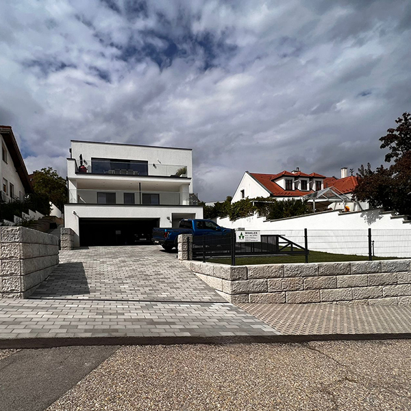Bei einem Privathaus in Donnerskirchen wurden mehrere Wände mit dem SW-Stützwandsystem errichtet. Drei Wände sind freistehend mit Vollsteinen ausgeführt und weisen beidseitige Sichtflächen auf. Die zwei weiteren Wände sind als Stützwand mit entsprechender Hinterfüllung ausgeführt.