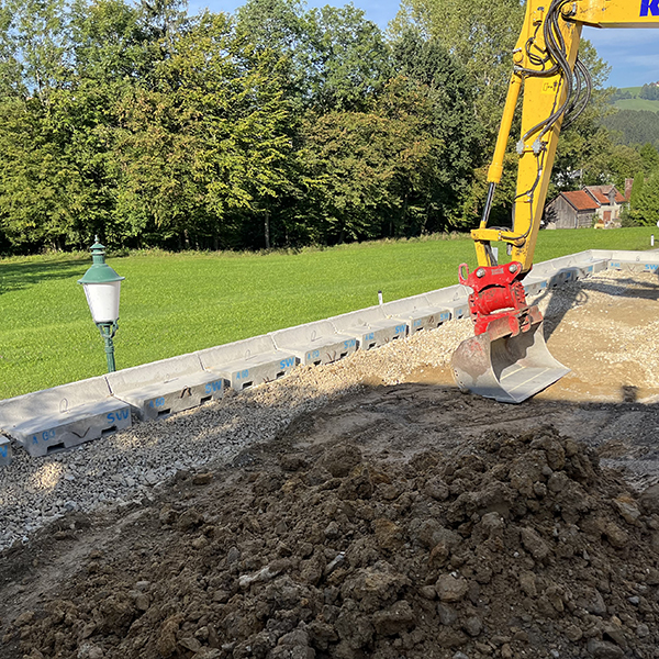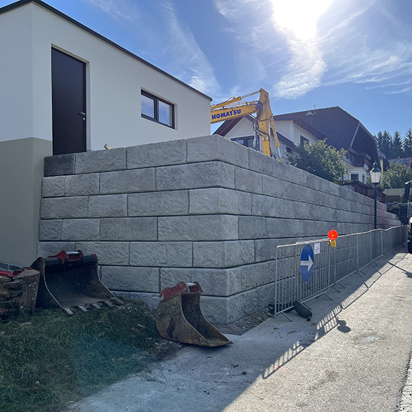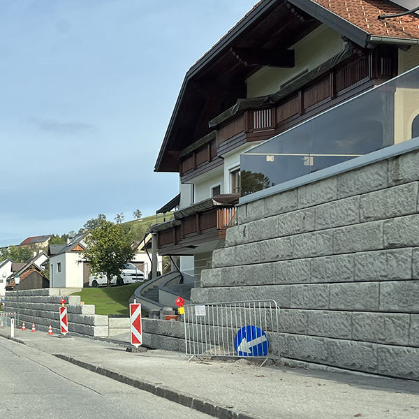 Errichtung einer SW-Stützwand zur Vergrößerung des Gartens im Zufahrtsbereich eines Einfamilienhauses in Ertl. Weiters wurde eine 2,8 m hohe Wand mit Außeneck und abgestuftem Bereich entlang der Hauptstraße errichtet.