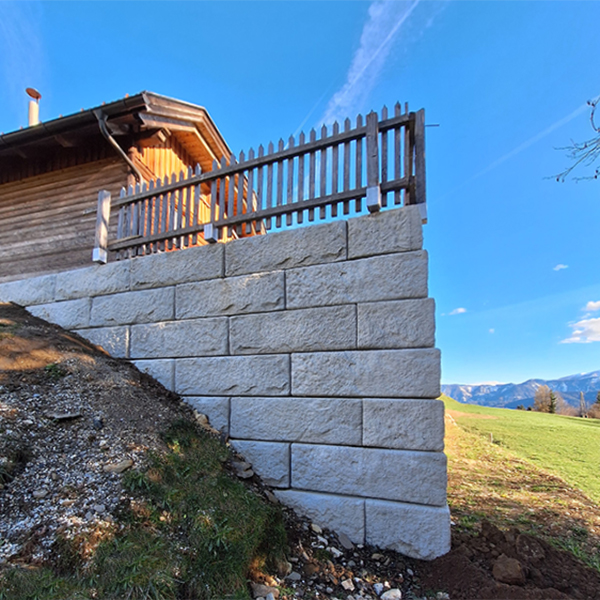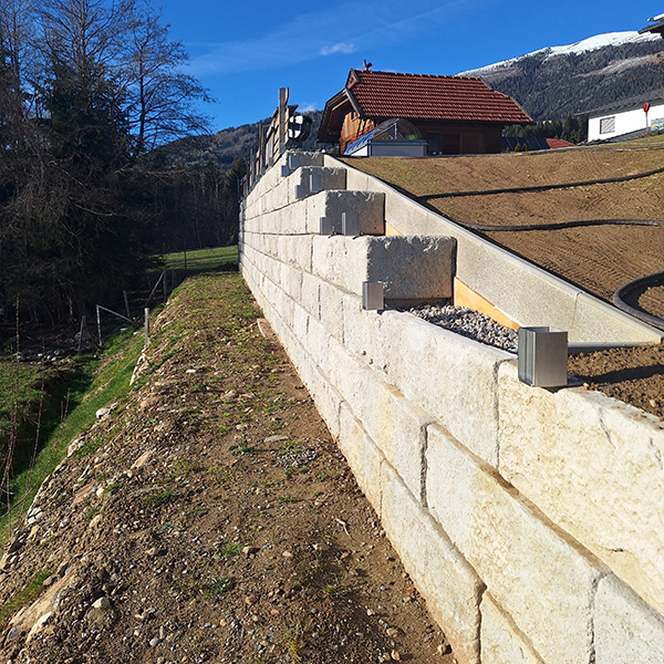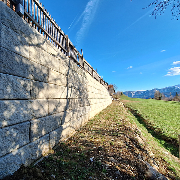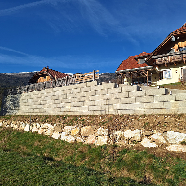 Bei diesem Privathaus in Fresach wurde eine pflegeintensive und veraltete Krainerwand durch das ästhetische und funktionelle SW-Stützwandsystem ersetzt. Gleichzeitig konnte durch eine Erhöhung der Stützmauer eine Begradigung der oben liegenden Gartenfläche erreicht werden.
