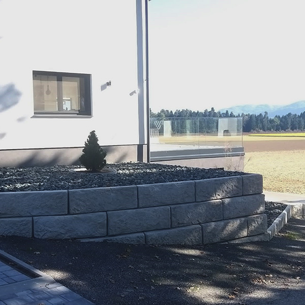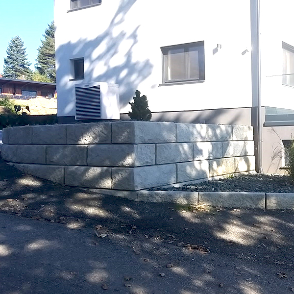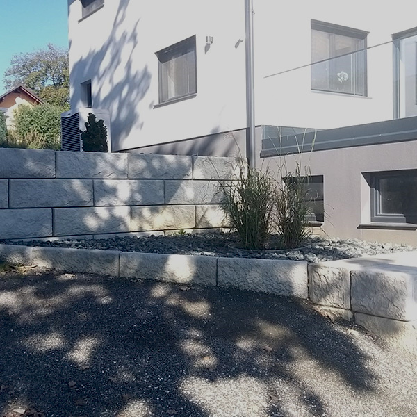 Hier wurde eine bestehende SW-Stützwand erweitert und die darüberliegenden Flächen in Form eines Steingartens begradigt.