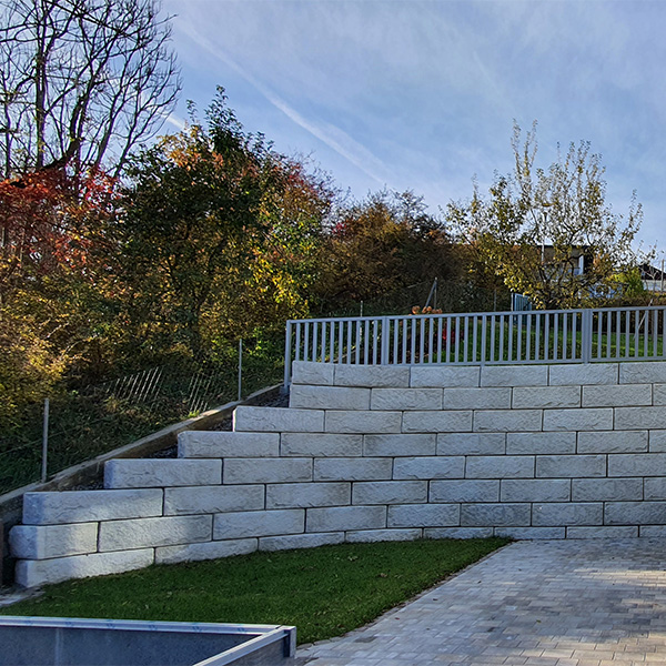 Das SW-Stützwandsystem wurde hier zur bestmöglichen Platzgewinnung und Erweiterung des Einfahrtsbereiches inkl. einem integrierten Treppenaufgang eingesetzt.
