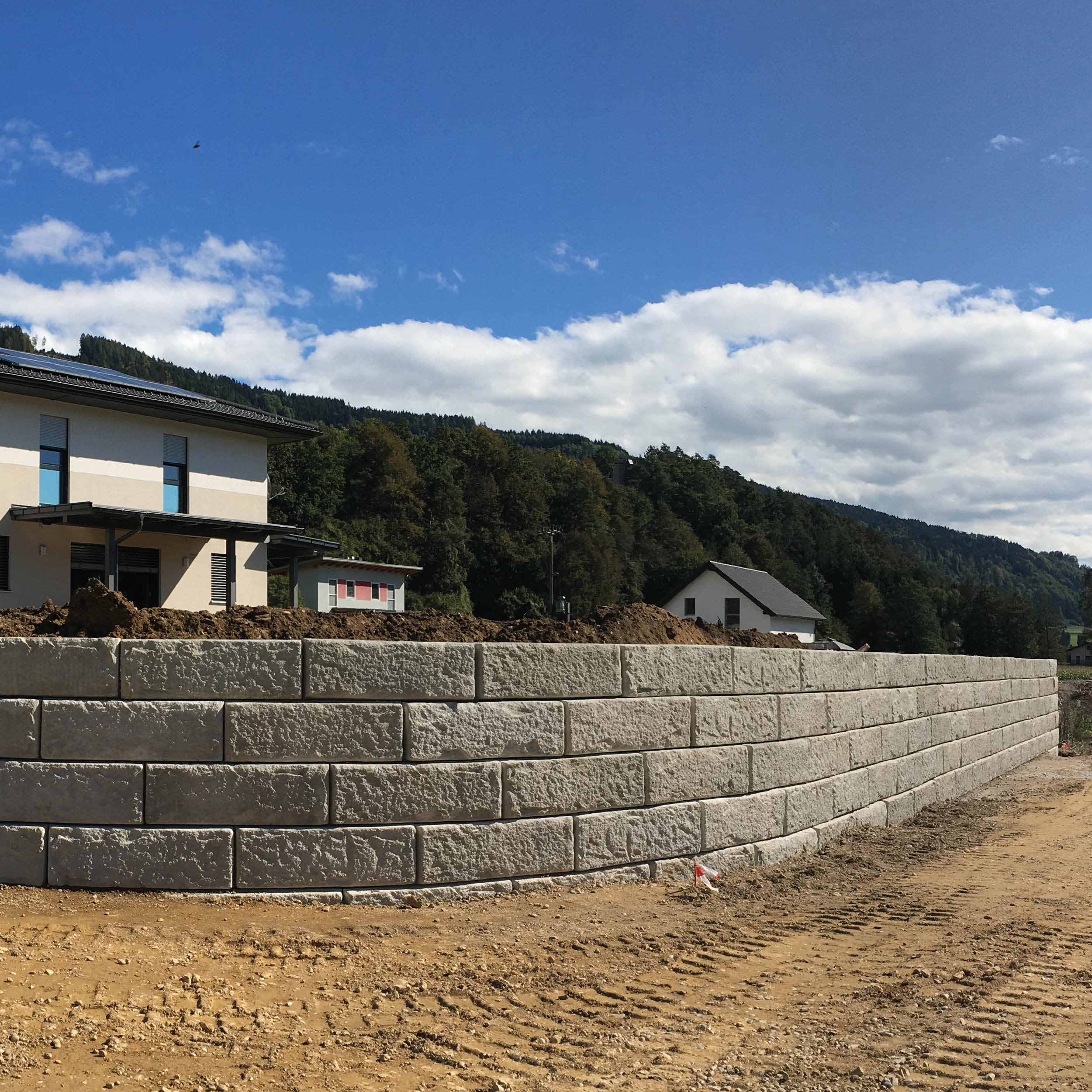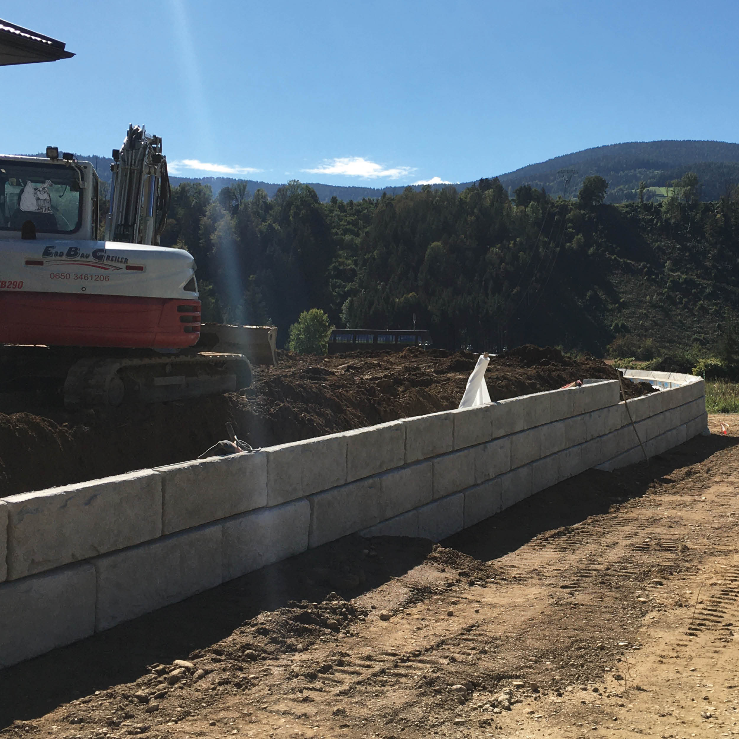 Hier wurde eine alter Hangbewuchs entfernt und durch das SW-Stützwandsystem für noch mehr Platzgewinn perfekt eingesetzt. Die Ausführung erfolgte kombiniert in Rund- und Eckausbildung, sowie teilweise mit Vollsteinen als Abschluss für die Errichtung eines Carports.