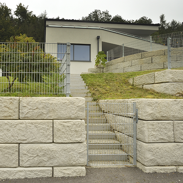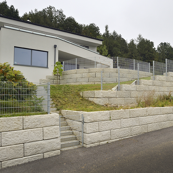 Zur optimalen Nutzung des Grundstückes wurde eine massive Stützwand errichtet. Die Wand hat im Terrassenbereich eine Rundung und einen integrierten Stiegenaufgang – zur Straßenseite hin wurde die bis zu 4 m hohe Wand einmal abgesetzt. So sind im vorderen Bereich zwei abgestufte, versetzte Wände errichtet worden. Der Zaun wurde direkt auf die Abschlusssteine montiert.