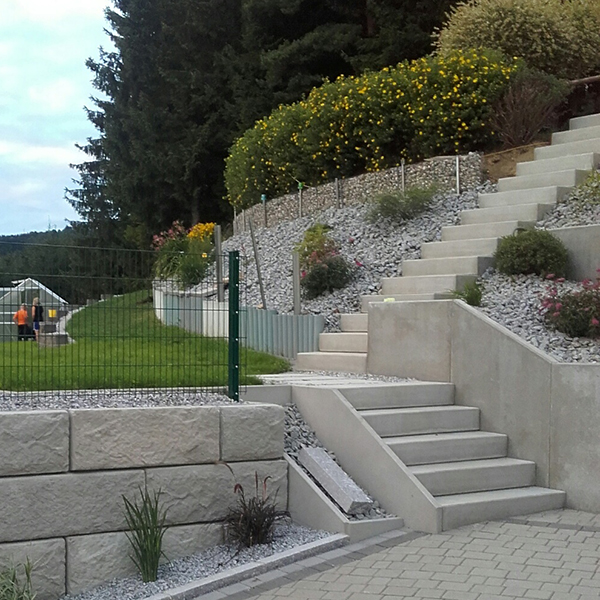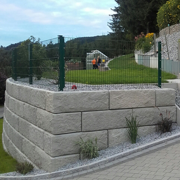 Die Firma Kiesenhofer konnte mit Hilfe unseres SW-Stützwandsystems den Hang ebnen und so mehr Platz für den Auftraggeber gewinnen. Angepasst an die Situation vor Ort, wurde hier ein schöner Außenradius umgesetzt.