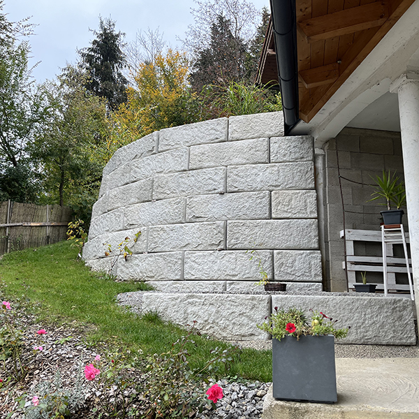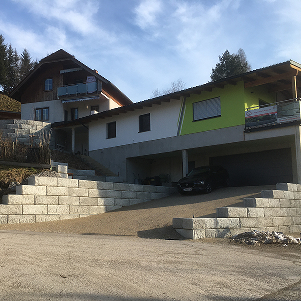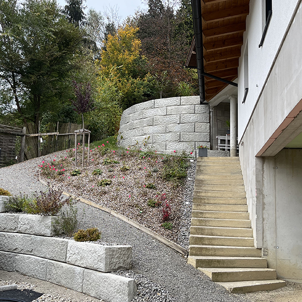 Bei dem Privathaus in Waidhofen an der Ybbs wurden mehrere Stützwände errichtet, darunter eine runde Wand im oberen Bereich des Grundstücks mit einem minimalen Radius von 4,5-5 m und eine Wand links und rechts im Bereich der Garagenzufahrt