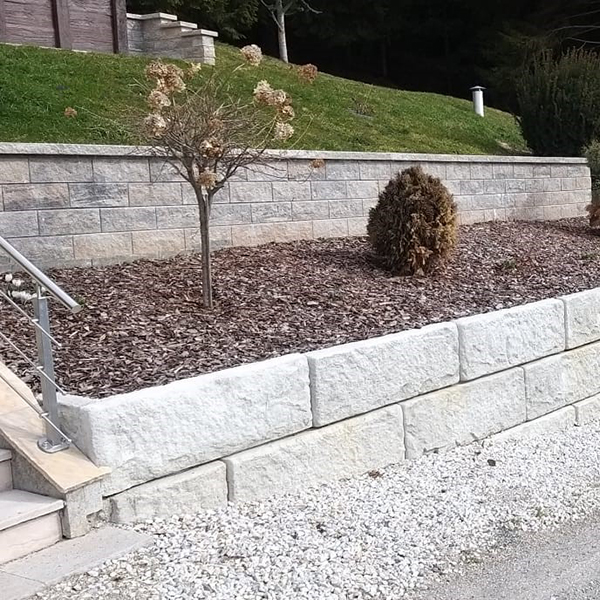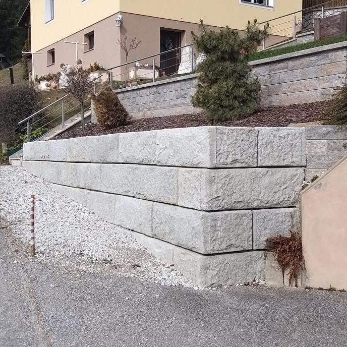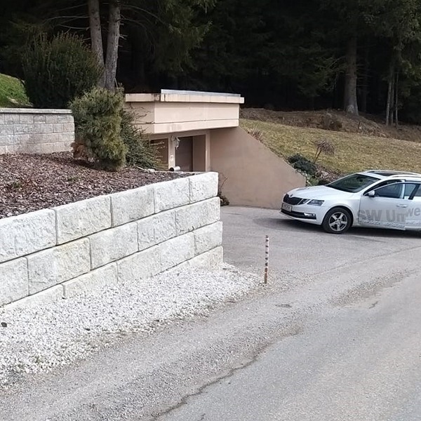 Bei dem Projekt wurde mit dem SW-Stützwandsystem ein abfallendes Grundstück zur Straße hin stabilisiert. Durch eine Bepflanzung oberhalb der Mauer konnten mit dem SW-Stützwandsystem optische Akzente gesetzt werden.