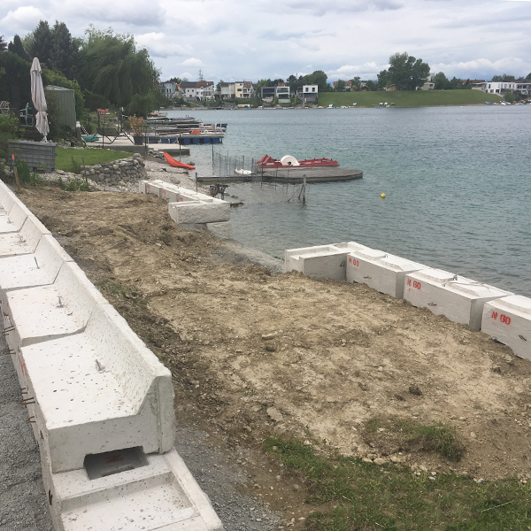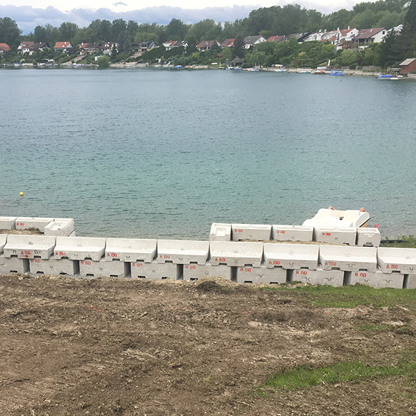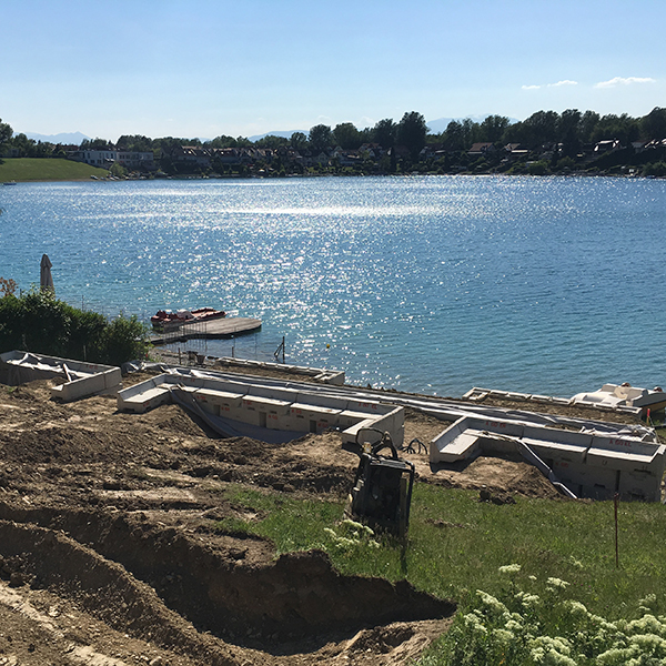 An einem Seegrundstück wurde der Hang auf drei Ebenen terrassiert. Aufgrund der hohen Betonqualität ist das Versetzen einer SW-Stützwand sowohl am, als auch unter Wasser möglich und somit optimal als Ufermauer einsetzbar.